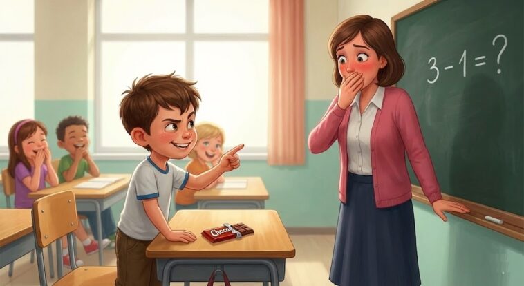 Η δασκάλα κοκκινίζει ελαφρώς, το σκέφτεται για λίγο με πονηρό ύφος και απαντά διστακτικά: – «Εεε… υποθέτω πως παντρεμένη είναι αυτή που βάζει ολόκληρη τη σοκολάτα στο στόμα της;»