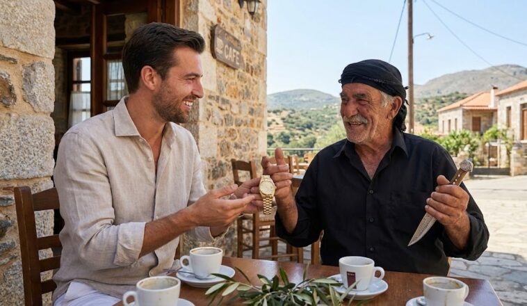 Πηγαίνει στην Κρήτη ένας τύπος με πολλά λεφτά και μαγεύεται από τις ομορφιές της. Κάποια στιγμή συναντάει έναν ντόπιο ο οποίος κρατά ένα ωραίο Κρητικό μαχαίρι.