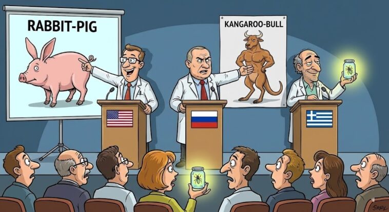 Πρώτος ανεβαίνει στο βήμα ο Αμερικανός αντιπρόσωπος, φουσκωμένος από υπερηφάνεια: — «Κυρίες και κύριοι, μετά από χρόνια ερευνών, δημιουργήσαμε το Λαγογούρουνο. Πρόκειται για έναν γενετικό συνδυασμό λαγού και χοίρου. Το πλεονέκτημά του; Πολλαπλασιάζεται με τους ρυθμούς του λαγού, αλλά μεγαλώνει και δίνει κρέας σαν το γουρούνι. Με αυτόν τον τρόπο, θα λύσουμε οριστικά το πρόβλημα της πείνας στον τρίτο κόσμο!» Το ακροατήριο ξεσπά σε ενθουσιώδη χειροκροτήματα.